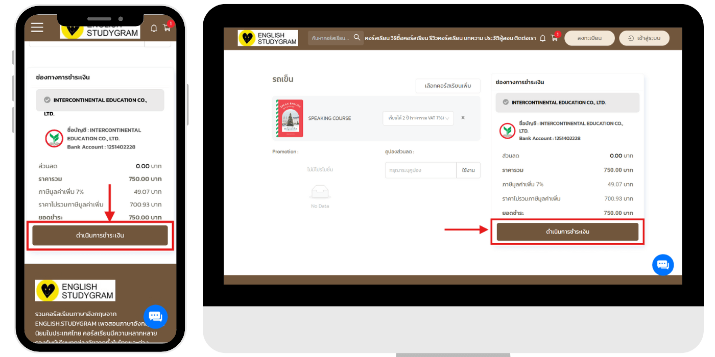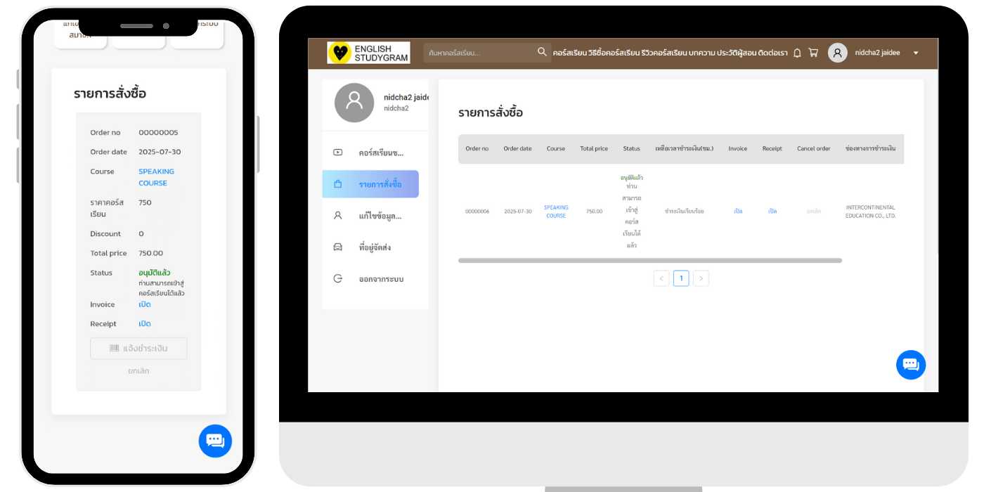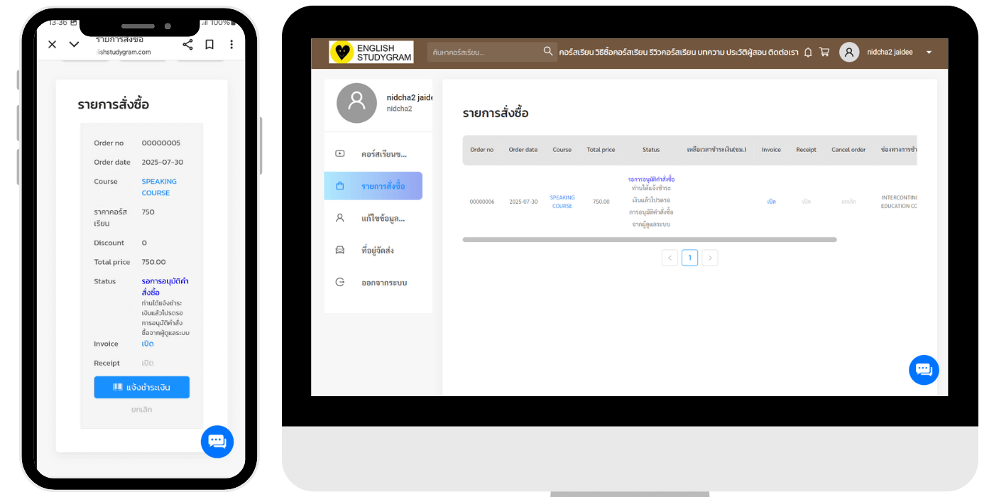 สามารถแจ้งชำระเงินได้โดยไปที่เมนู จัดการคำสั่งซื้อ (ขั้นตอน การแจ้งชำระเงิน ไว้แจ้งทีหลัง)